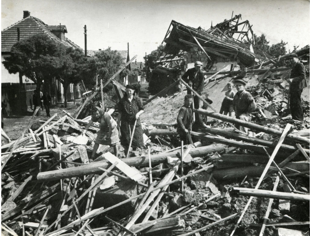 Mentési munkálatok a bombázás után. Hordágyakkal mennek a vöröskeresztes autók felé (MNM)